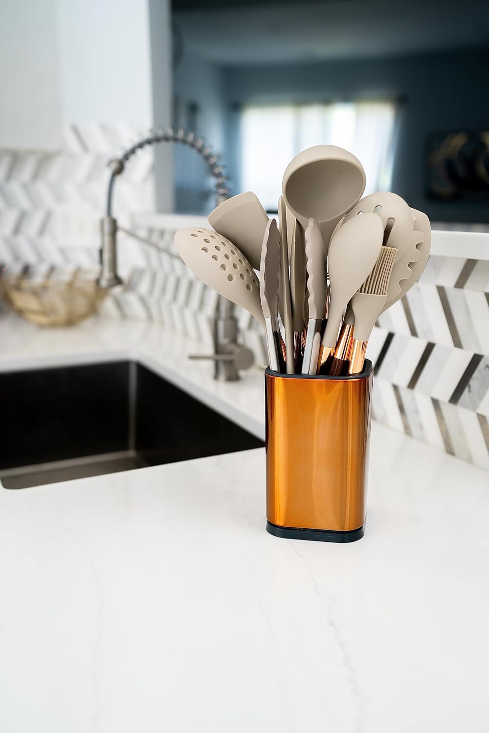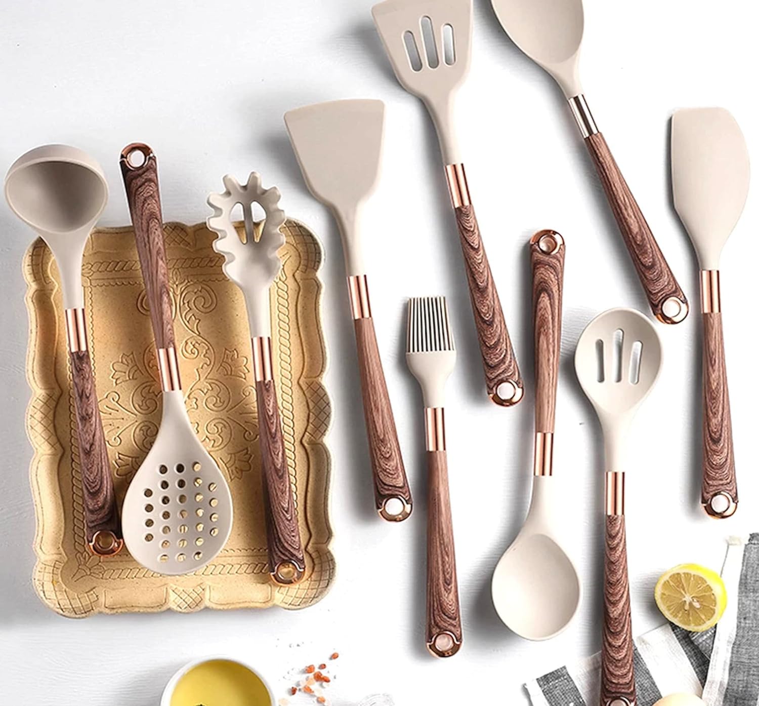 Chef Kitchen Cooking Utensils Set, Non-Stick Silicone Cooking Kitchen Utensil Set with Holder, Wooden Handle Silicone Kitchen Gadgets Utensil Set (OakWood)