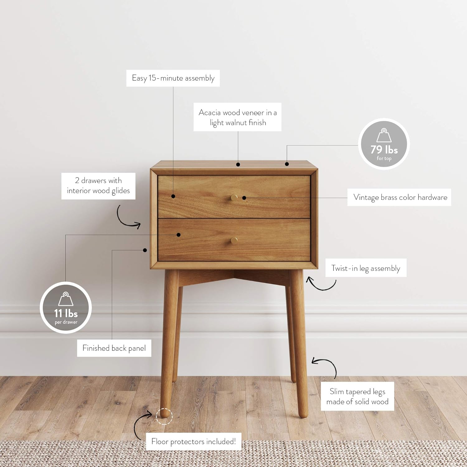 • Store gadgets, books, or magazines in this easy-glide, two-tier drawer nightstand or end table.