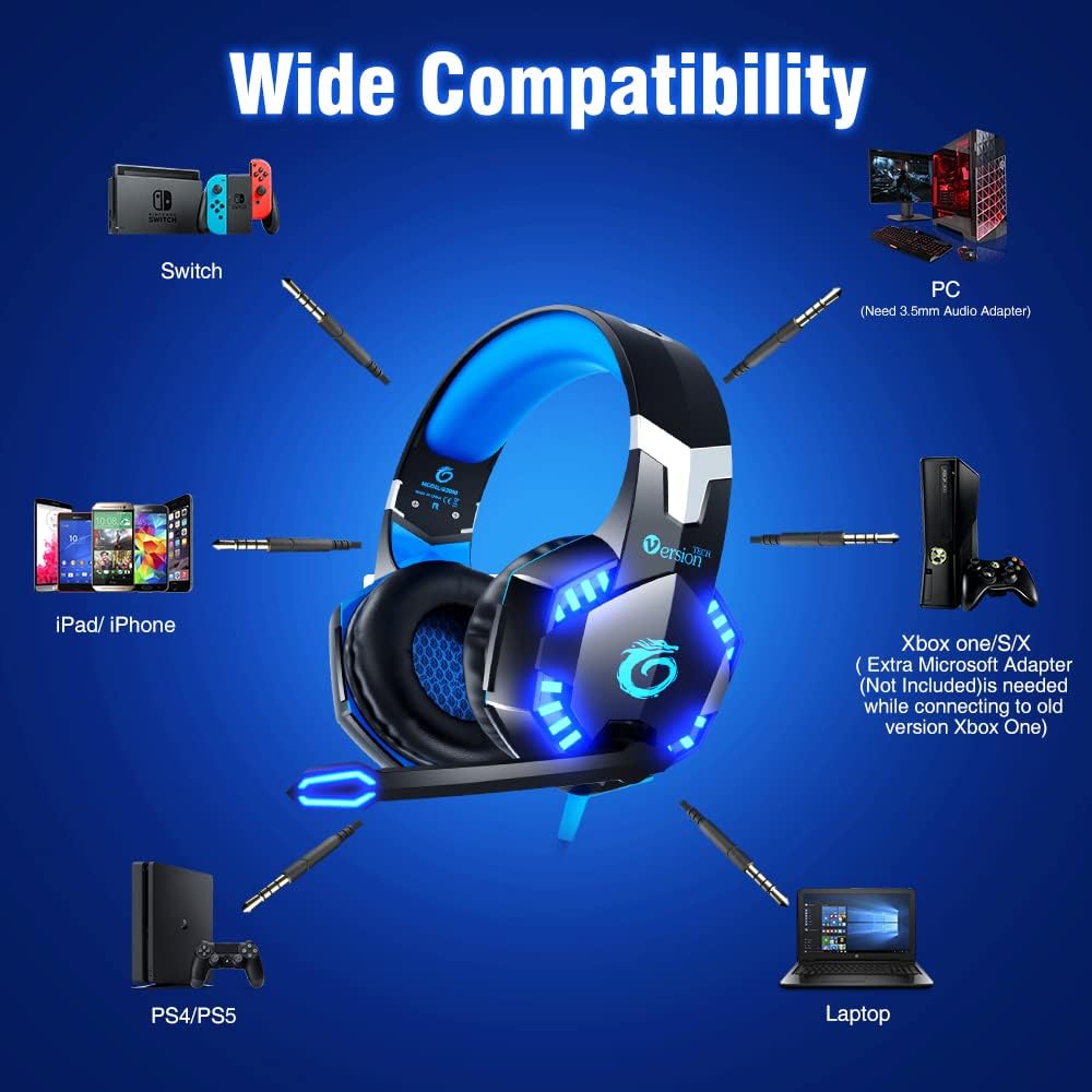 VersionTECH. G2000 Gaming Headset for PS5 PS4 Xbox One Controller,Bass Surround Noise Cancelling Mic, Over Ear Headphones with LED Lights for Mac Laptop Xbox Series X S Nintendo Switch NES PC Games