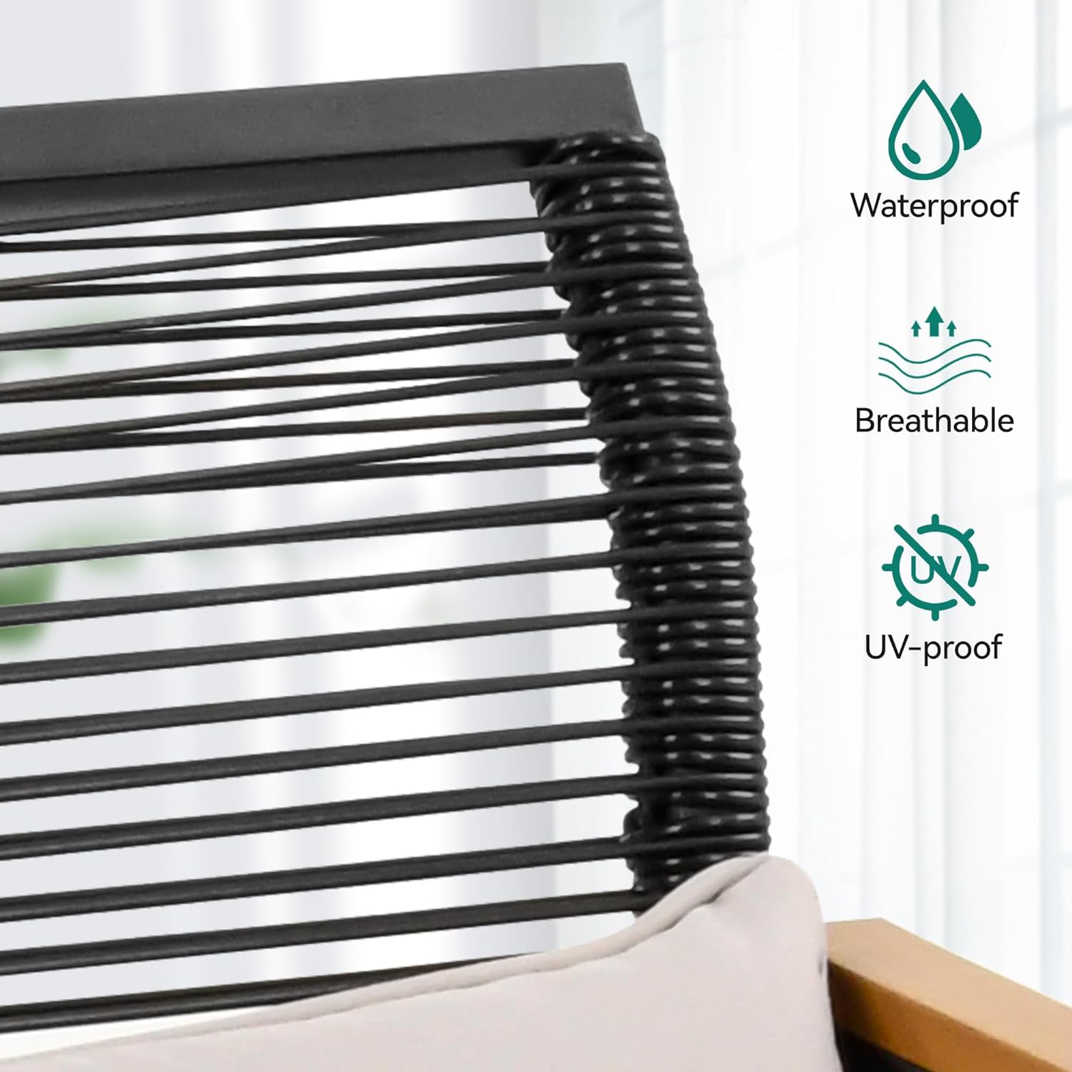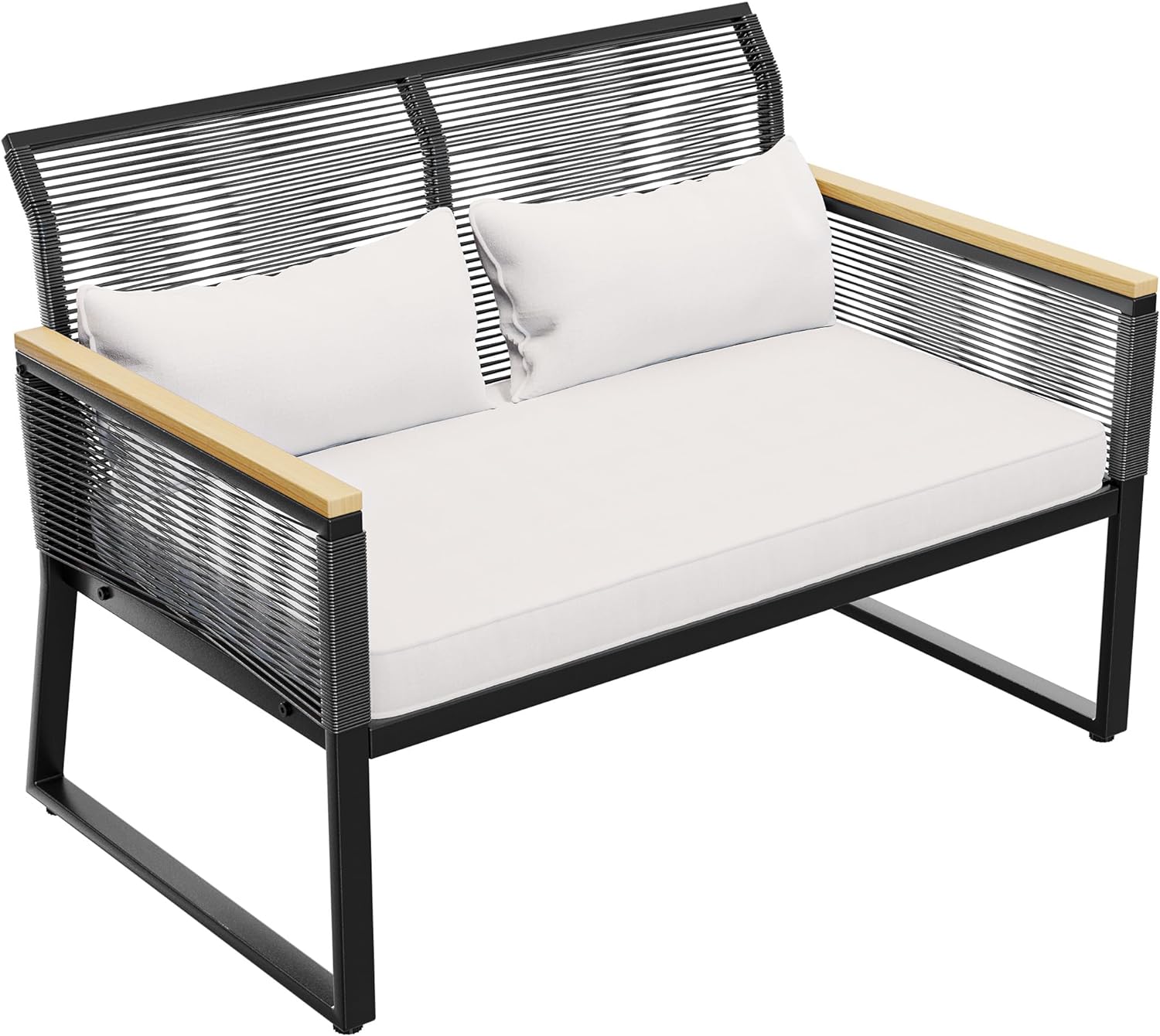 • COMFORTABLE LOVESEAT: The woven rattan sofa stands out with mixed colored armrests - natural wood and black materials harmonize with rattan design; A stylish set of loveseat chair to bring richness to your living room, porch, courtyard, and poolside